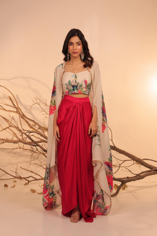 Crimson Bloom Indo-Western Drape Set with Embroidered Cape