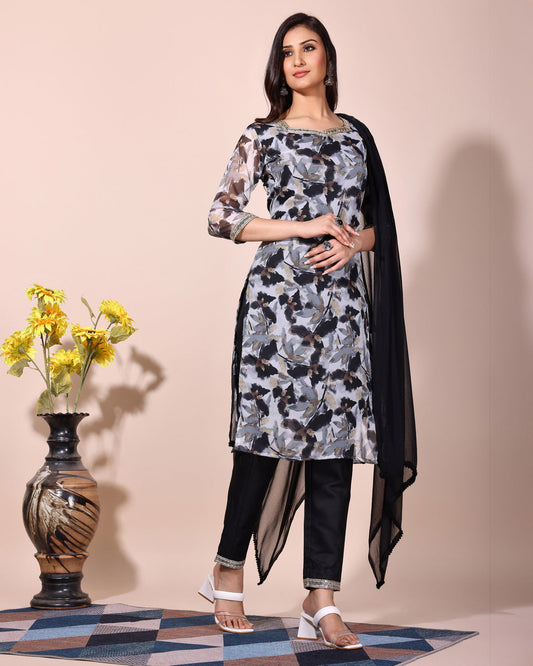 Black Floral Embroidered Georgette Kurti Pant Set With Dupatta