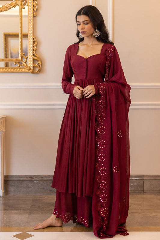 Beautiful Maroon Anarkali Top With Palazzo And Dupatta