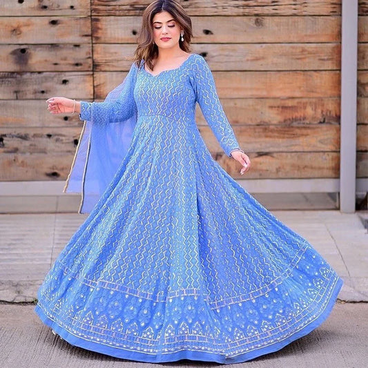 BEAUTIFUL SEQUENCE EMBROIDERY WORKED SKY COLORED FLOOR TOUCH GOWN AND DUPATT